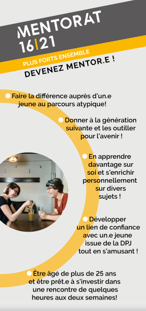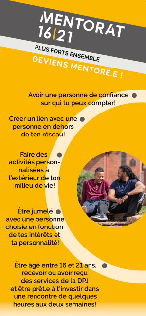 Mentorat 16|21 est un programme de jumelage visant prioritairement les jeunes québécois.es âgés de 16 à 21 ans ayant un historique de placement dans un centre de réadaptation, en foyer de groupe, en ressource de type familiale ou dont le milieu de vie n'offre pas la possibilité d'avoir un lien avec un adulte qui pourrait agir à titre de modèle significatif.